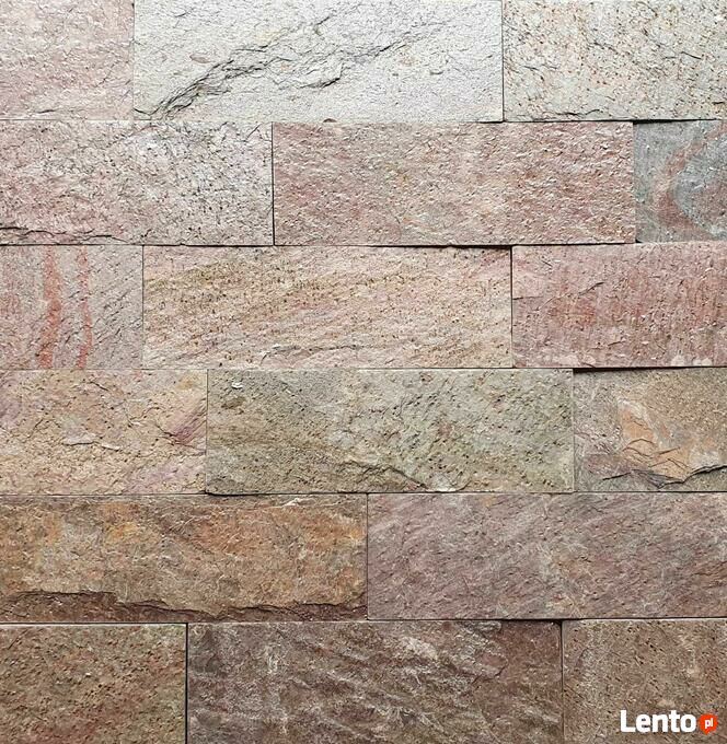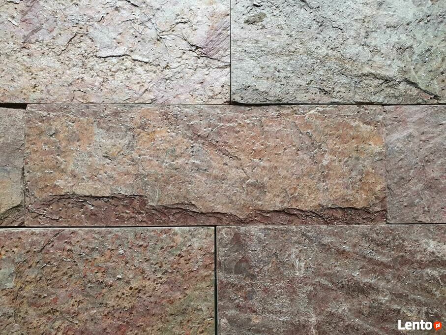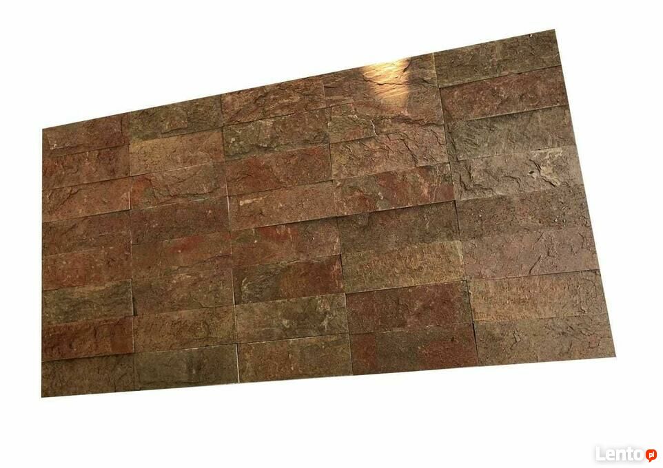 Kamień naturalny kwarcytowy miedziany o powierzchni naturalnej - łupanej.Doskonałe rozwiązanie na elewację budynku, ogrodzenie czy też ścianę dekoracyjna wewnątrz.